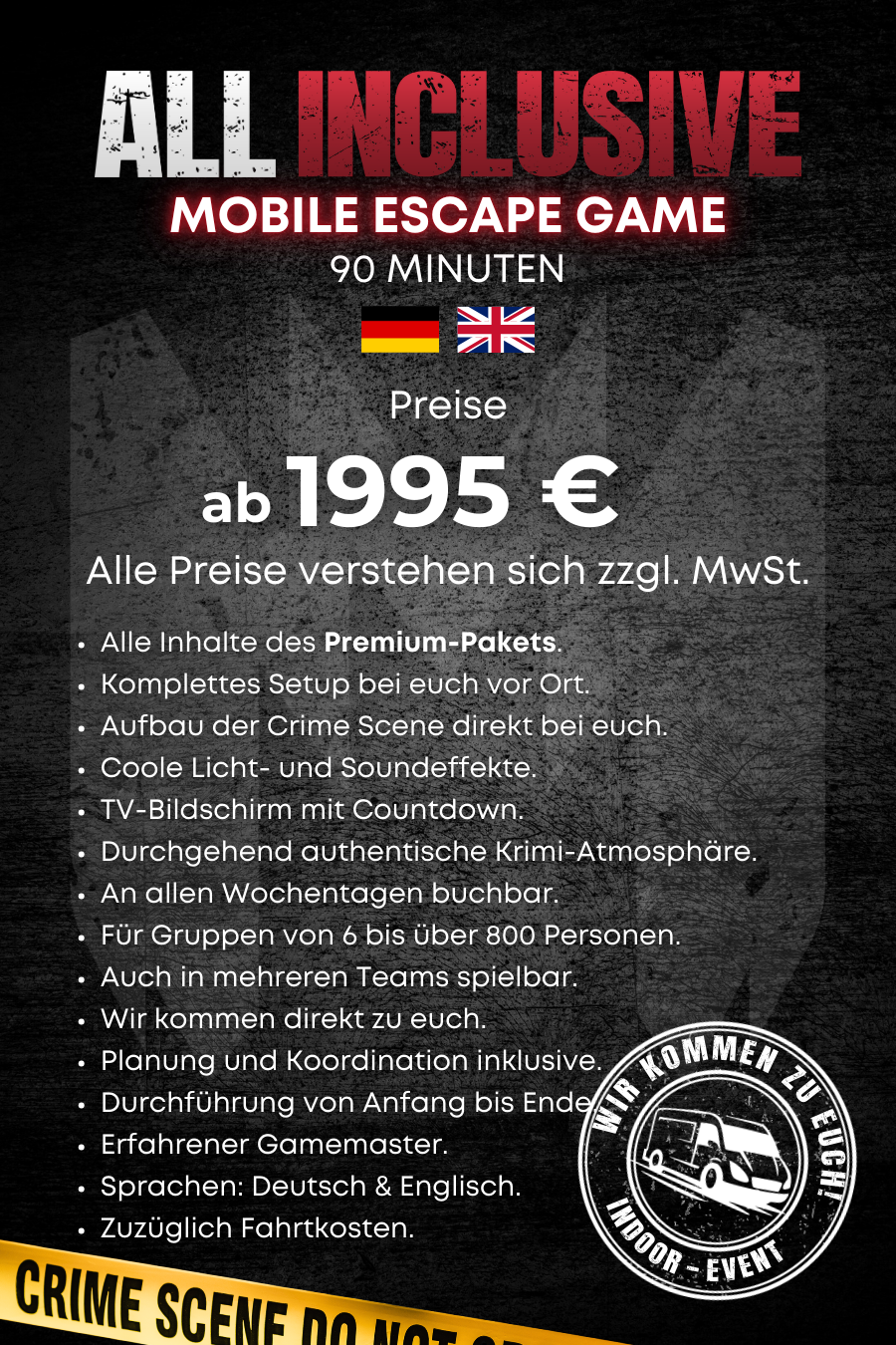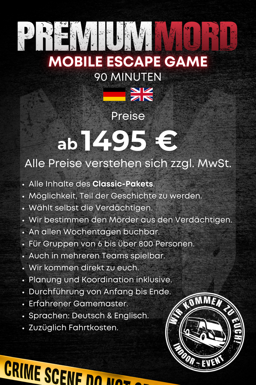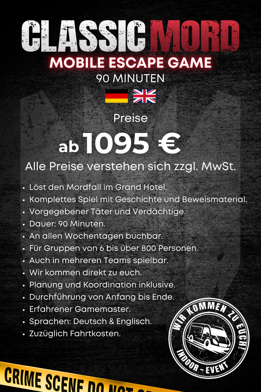 Und für alle, die es noch intensiver mögen: Wir sorgen auf Wunsch für Extra-Drama – mit Lichteffekten, Bühnenbildern und einer Atmosphäre, die euch direkt in die Welt des Verbrechens hineinzieht.